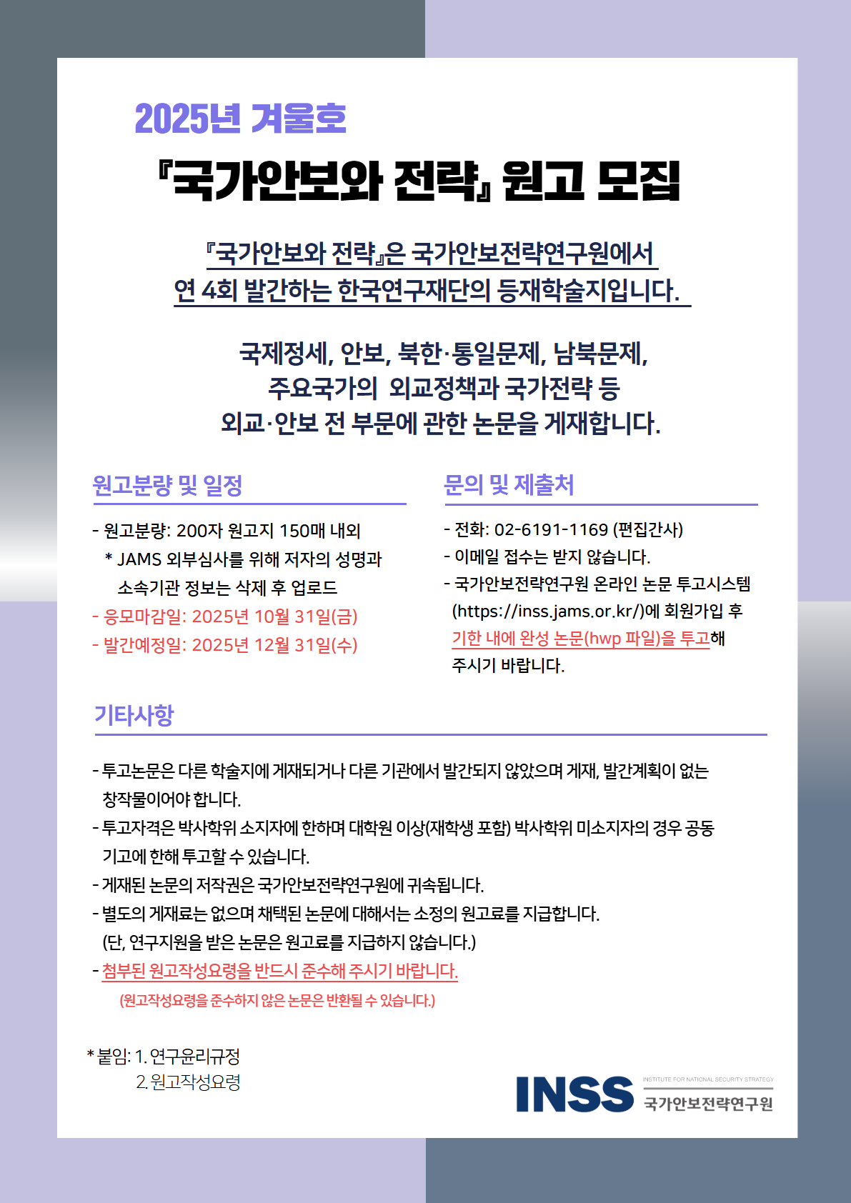 [원고모집]『국가안보와 전략』2025년 겨울호