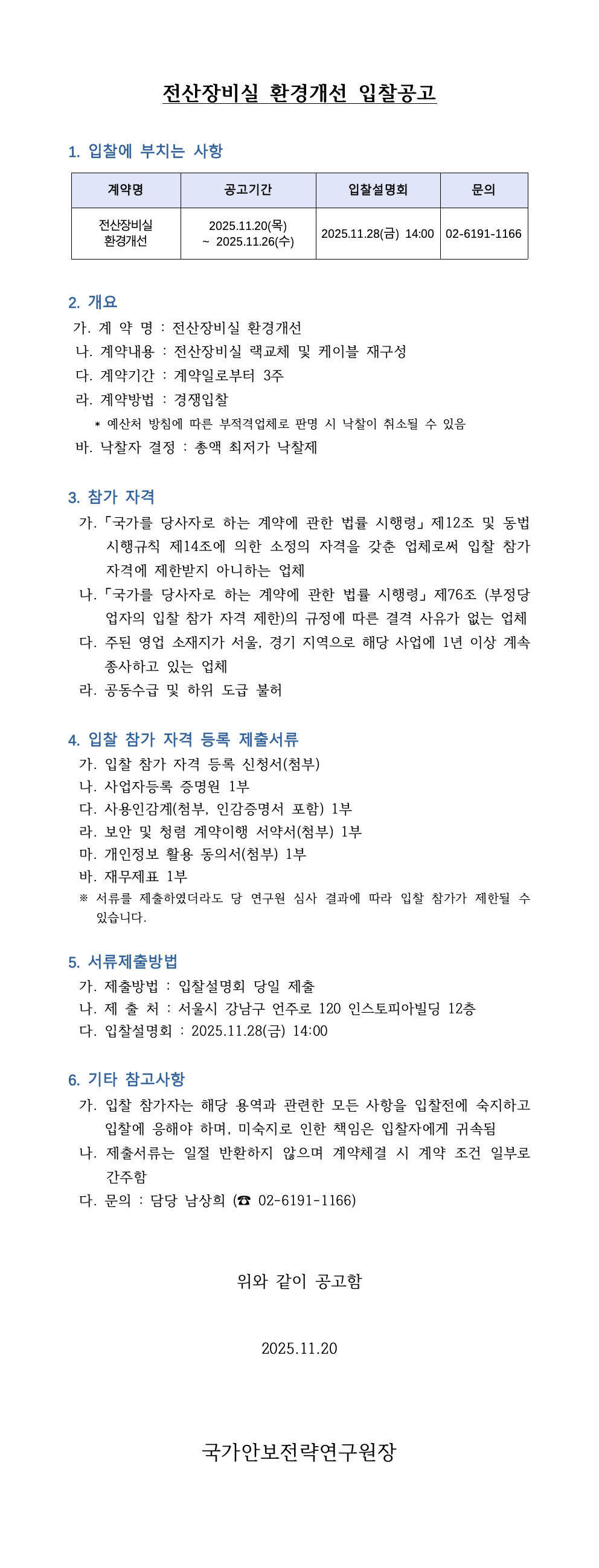 [입찰공고] 국가안보전략연구원 전산장비실 환경개선