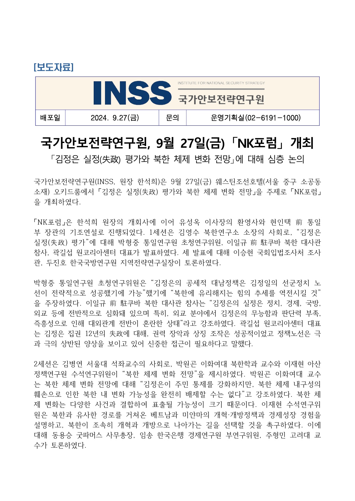 국가안보전략연구원, 9월 27일(금)「NK포럼」개최 (사전 보도자료)